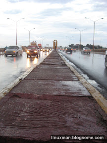 Hace unos instantes volví a cruzar el puente acompañado de mi hermano y su familia. Les pido que tengan la mayor de las precauciones cuando pasen de un lado a otro del puente, las planchas de cemento del camellón central están muy dañadas y van a dar directamente al río.