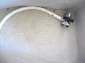 El primer arranque fue un rotundo fracaso :S , el caudal de agua que jalaba la bomba era tal que en segundos bajo el nivel del depósito a la mitad y como el volumen de agua que estaba en la parte superior era tan grande hacía que el agua saliera disparada hacia la pared formando un charco indeseable.