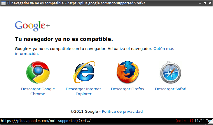 Todo iba bastante bien hasta que llegamos al punto de Google Plus. Pude iniciar sesión pero lo que me apareció fue un mensaje diciendo: Tu navegador ya no se compatible y me ofreció varias opciones.