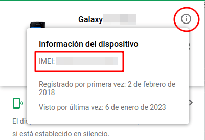 Si vas a la página de Encontrar tu teléfono aparte de que puedes intentar localizarlo, emitir un sonido o bloquear tu teléfono también tiene a la mano el IMEI del dispositivo.