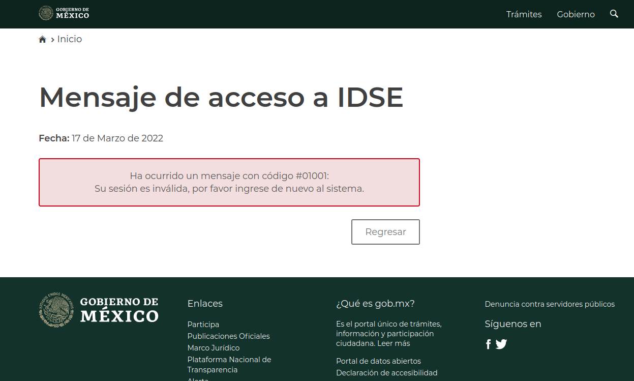 Ha ocurrido un mensaje con código #01001: Su sesión es inválida, por favor ingrese de nuevo al sistema.
