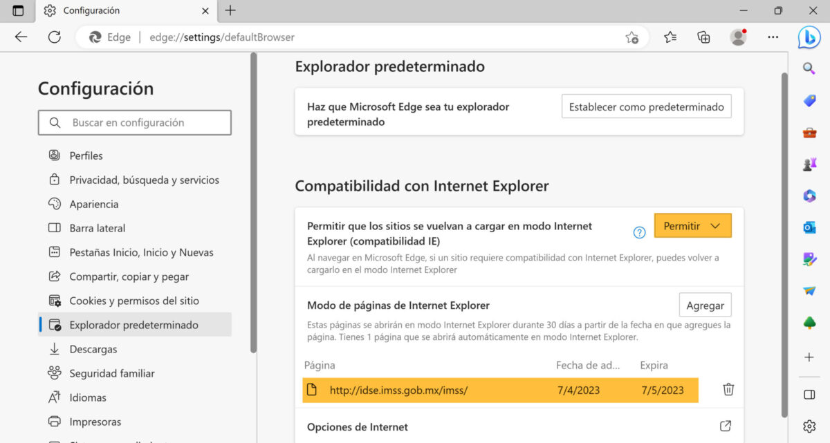 En donde dice Permitir que los sitios vuelvan a cargar en modo Internet Explorer (compatibilidad IE) seleccionamos Permitir.