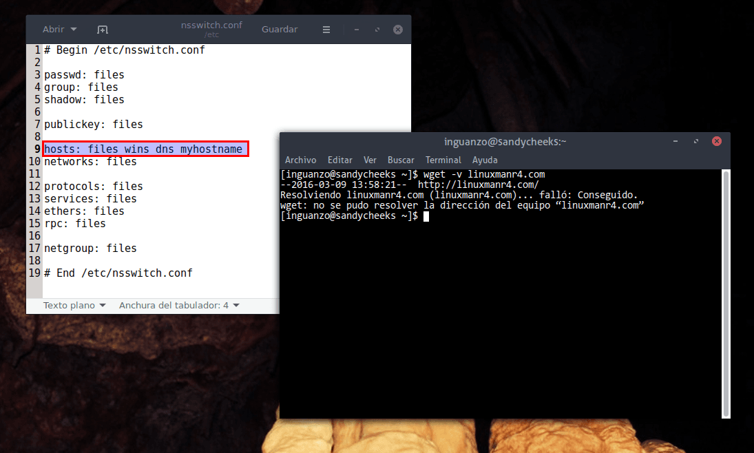 Revisando en internet me encontré una sugerencia en la que decían que el problema podría estar en el archivo nsswitch.conf , un archivo para determinar el origen (y el orden) para obtener información de las bases de datos de la red.