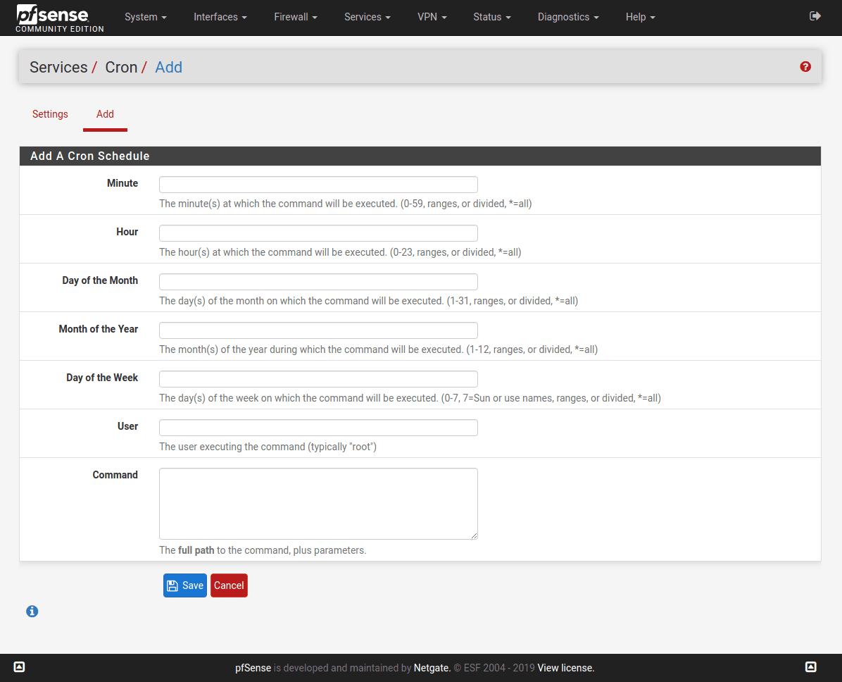Tuve suerte, parece que no hay muchas diferencias con cron en FreeBSD y más aún, pfSense incluye un paquete que ayuda a configurar las tareas ¡Excelente!.