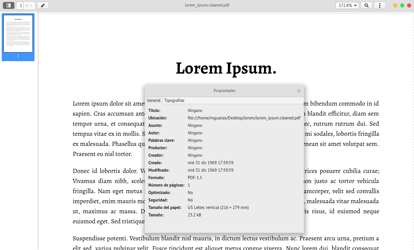 Como pueden ver en la imagen, se pueden ver los detalles de la fecha y hora de creación del archivo, las tipografías utilizadas y con que programa se hizo.