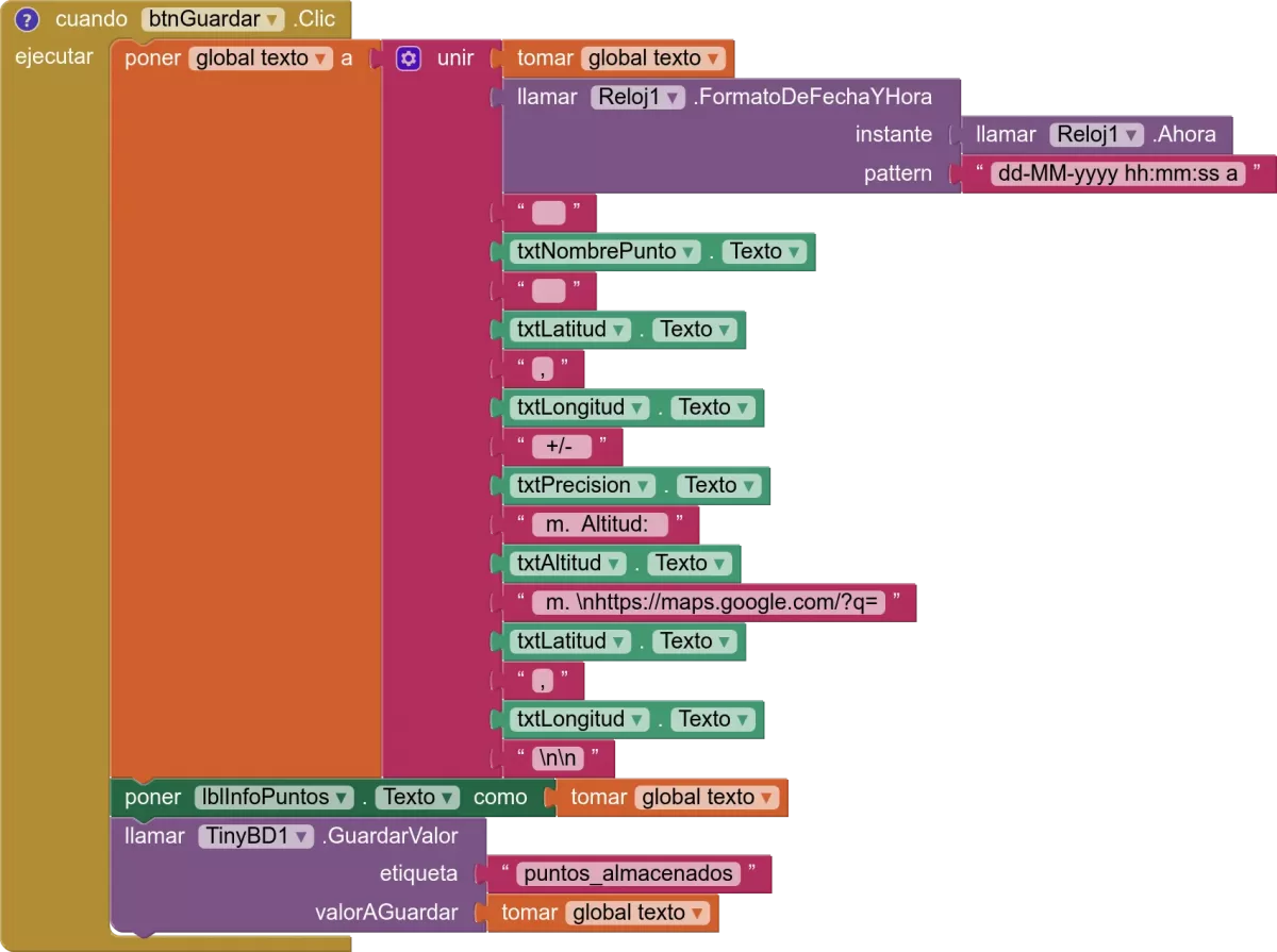 El botón de Guardar es todo un caso. Es el bloque más grande del proyecto porque hace la unión de mucha información para agregarla a una lista de texto.