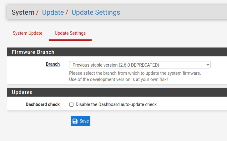 En System - Update - Update Settings establecí la rama a la versión 2.6.0