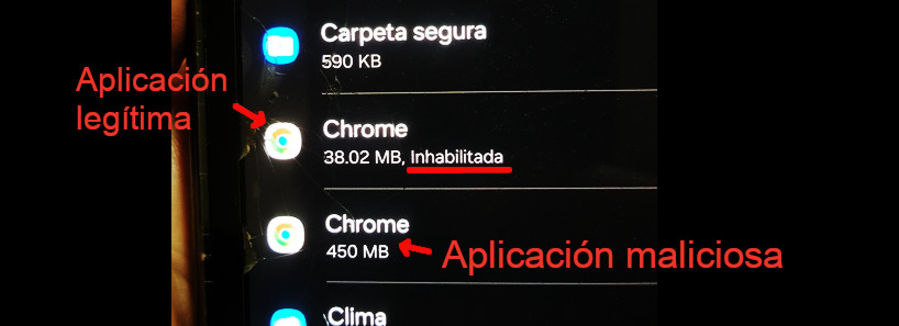 Nuevamente, desactivo el internet para poder manipular el teléfono sin tantas interrupciones y al revisar las aplicaciones veo los dos Chrome. El falso es el que tiene un número de versión muy bajo.